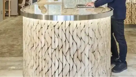 活用方法が限られるバタ材(木の背板部分)約1万個を活用した什器です。プロジェクトテーマの「エシカル」に沿うストーリー性と意匠のユニークさが特徴です。